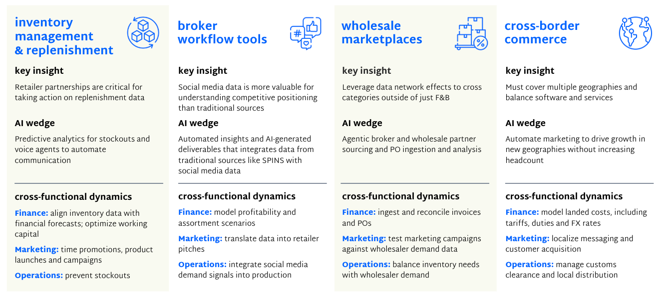 Leverage AI to move across functions. The most compelling investment opportunities enabling omnichannel expansion will use AI to bridge the data gap across functions within a team, specifically finance, operations and marketing. Each of these 3 teams must work in concert to launch and scale across multiple distribution channels, but are often working in either non-AI-native tools or in siloed AI point solutions.